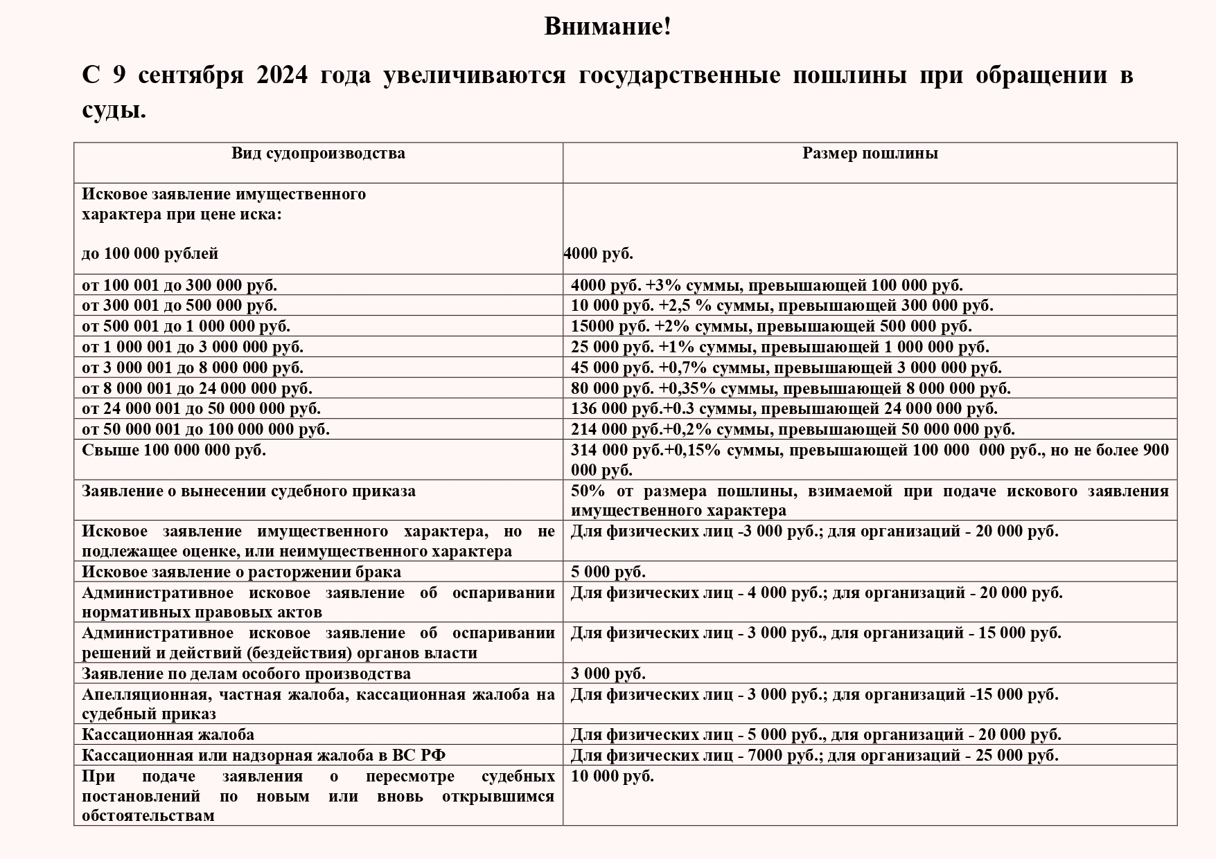 Размеры государственной пошлины по делам, рассматриваемым Верховным Судом Российской Федерации, судами общей юрисдикции, мировыми судьями, указаны в статье 333.19 Налогового кодекса РФ.